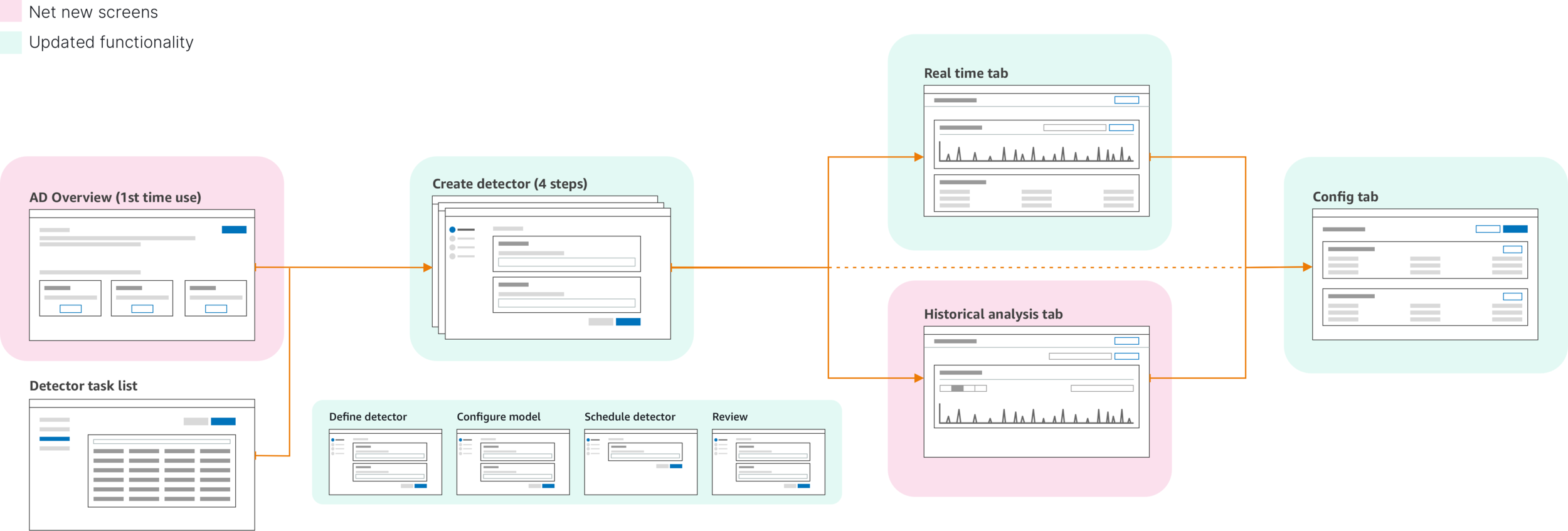 An overview page was added to give customers the ability to learn about anomaly detection and easily find further documentation as well as sample detectors up front that could be quickly set up for hands-on learning.